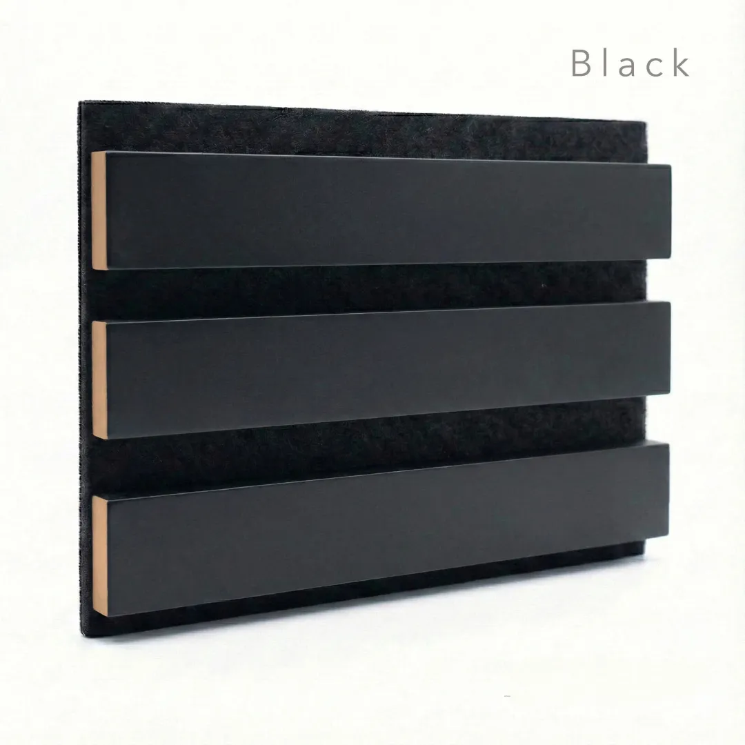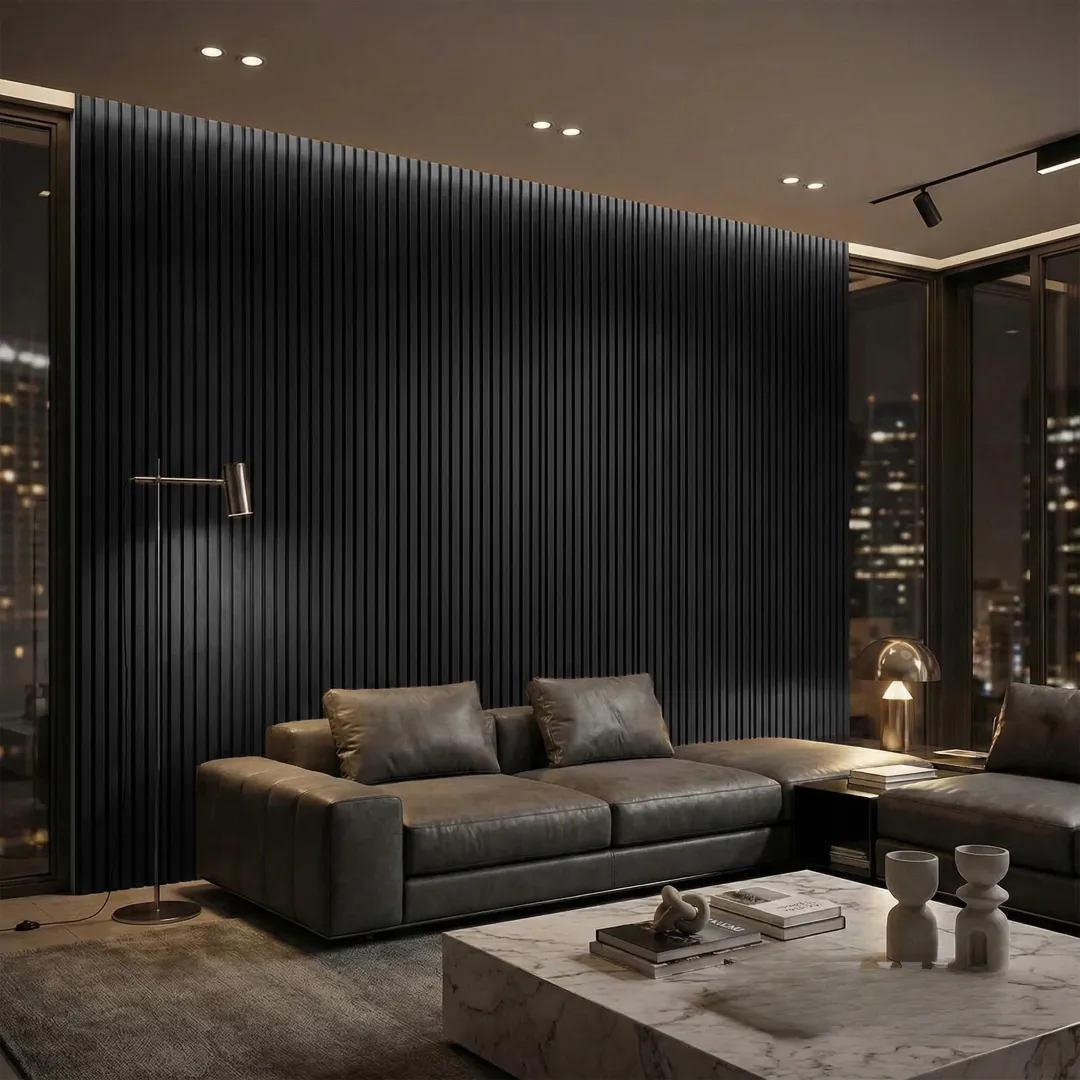 Define your interior with the commanding presence of the Black Coloured Acoustic Slat Wall Panel. Moving beyond traditional finishes, this collection features a precision 3-sided wrap-around edge, ensuring a deep, uniform black tone from every visible angle. It is the definitive choice for creating high-contrast, modern spaces with a seamless finish.