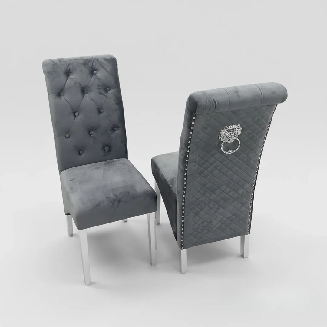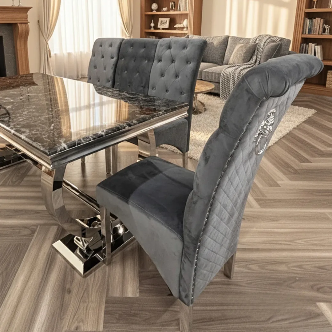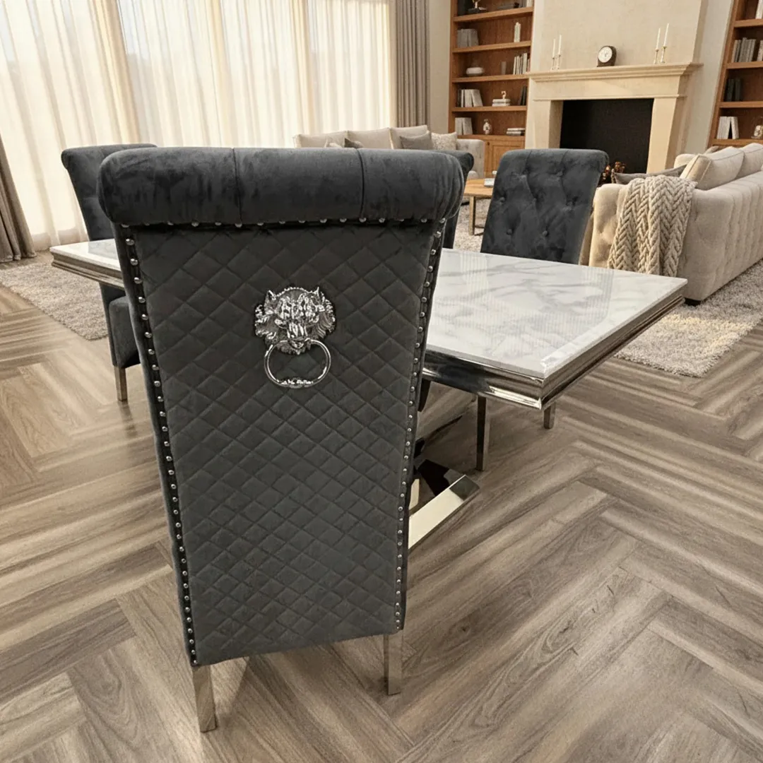 The Einar Dining Chair in dark grey plush velvet is the perfect balance of luxury, style, and comfort. Its elegant finish is enhanced by a striking chrome lion knocker on a quilted stitched back, creating a sophisticated focal point in any dining room.