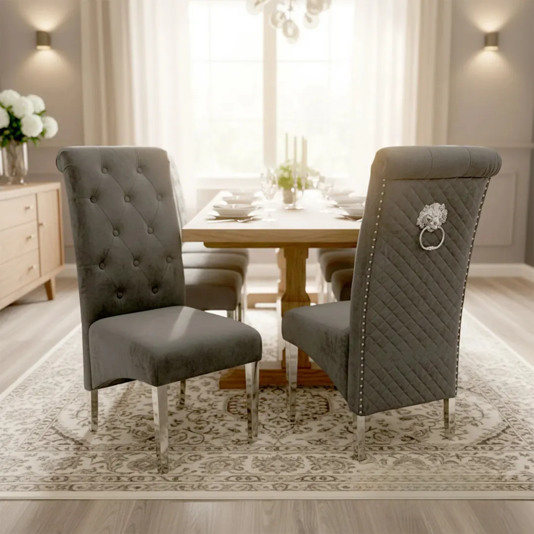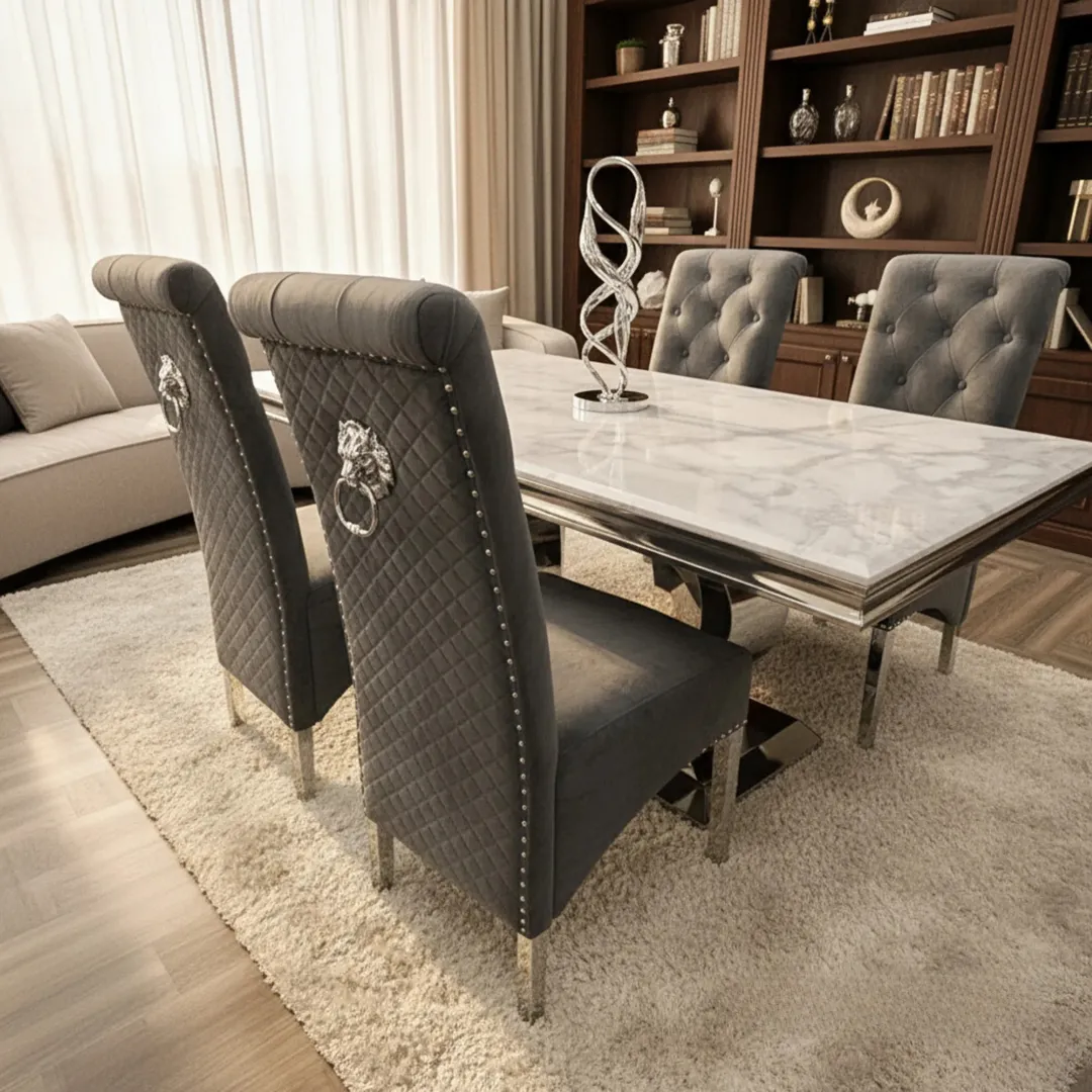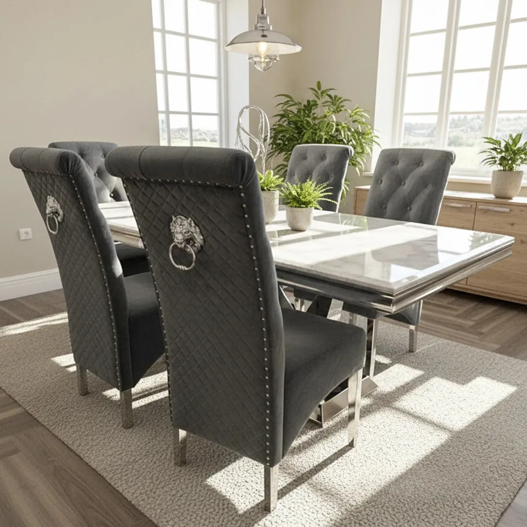 The Einar Dining Chair in dark grey plush velvet is the perfect balance of luxury, style, and comfort. Its elegant finish is enhanced by a striking chrome lion knocker on a quilted stitched back, creating a sophisticated focal point in any dining room.