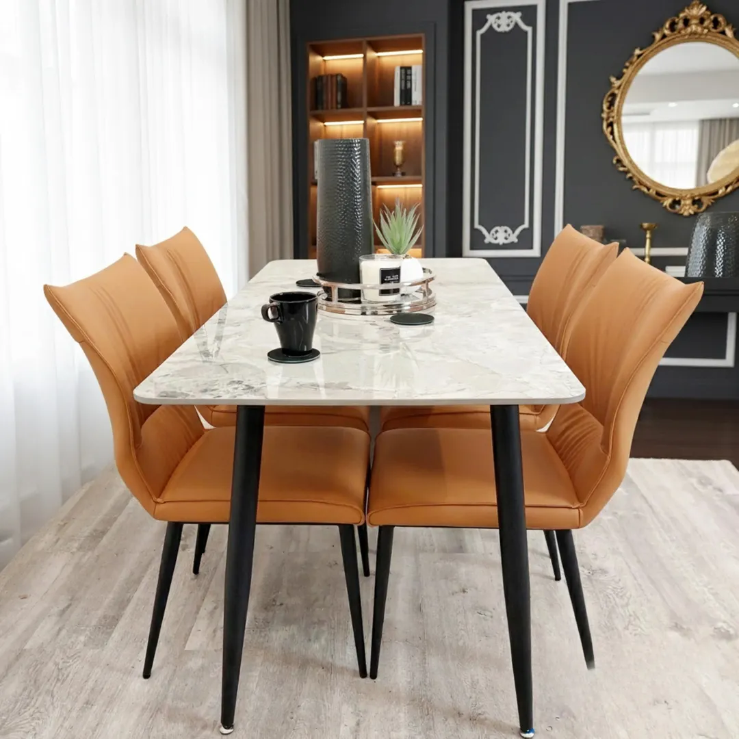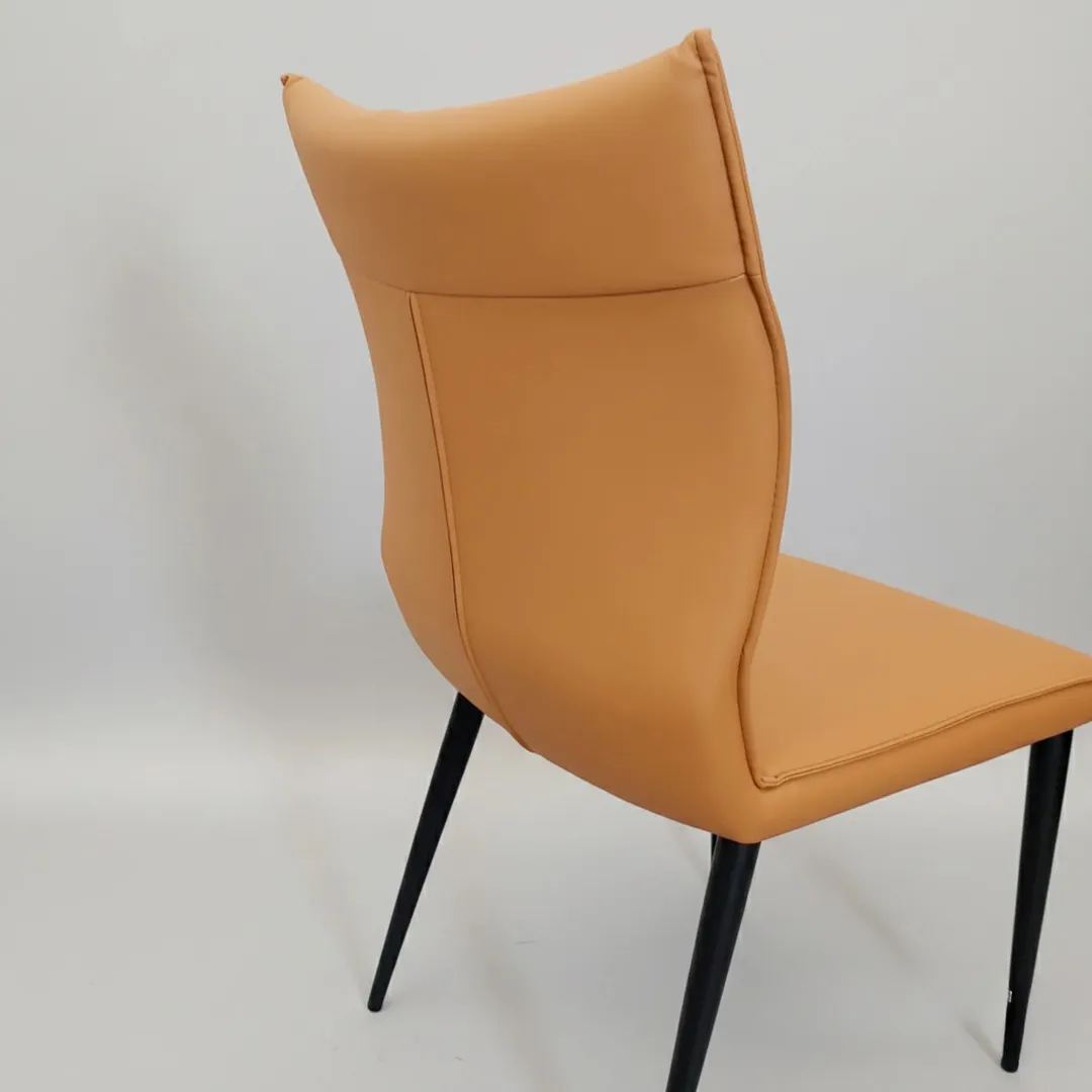 The Folke Dining Chair in Tan Orange faux leather combines modern Scandinavian style with premium comfort. Featuring a distinctive ruched stitching back design, this chair delivers a sleek yet inviting aesthetic that transforms any dining space.