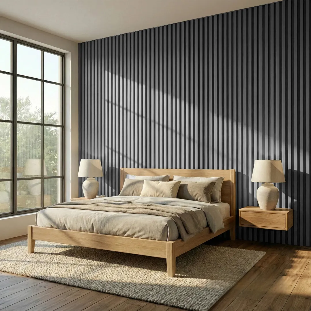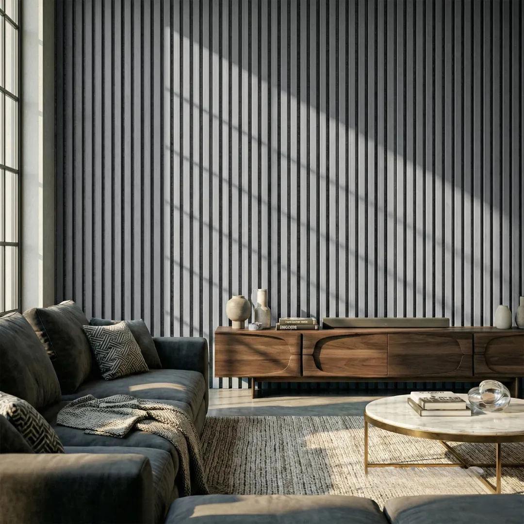 Achieve a sleek, architectural look with the Grey Coloured Acoustic Slat Wall Panel. This mid-to-cool grey tone provides a striking urban aesthetic, featuring a precision 3-sided wrap-around edge that ensures a clean and continuous finish across every slat. It is designed to bring a sharp, professional edge to modern living rooms, studios, and commercial spaces.