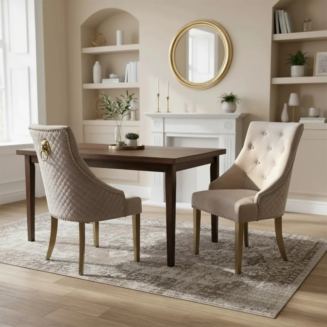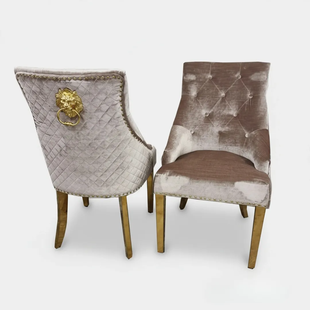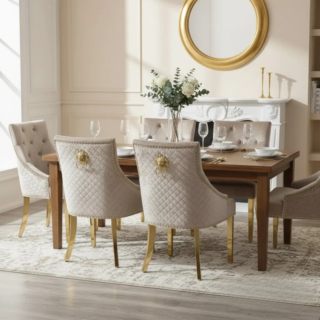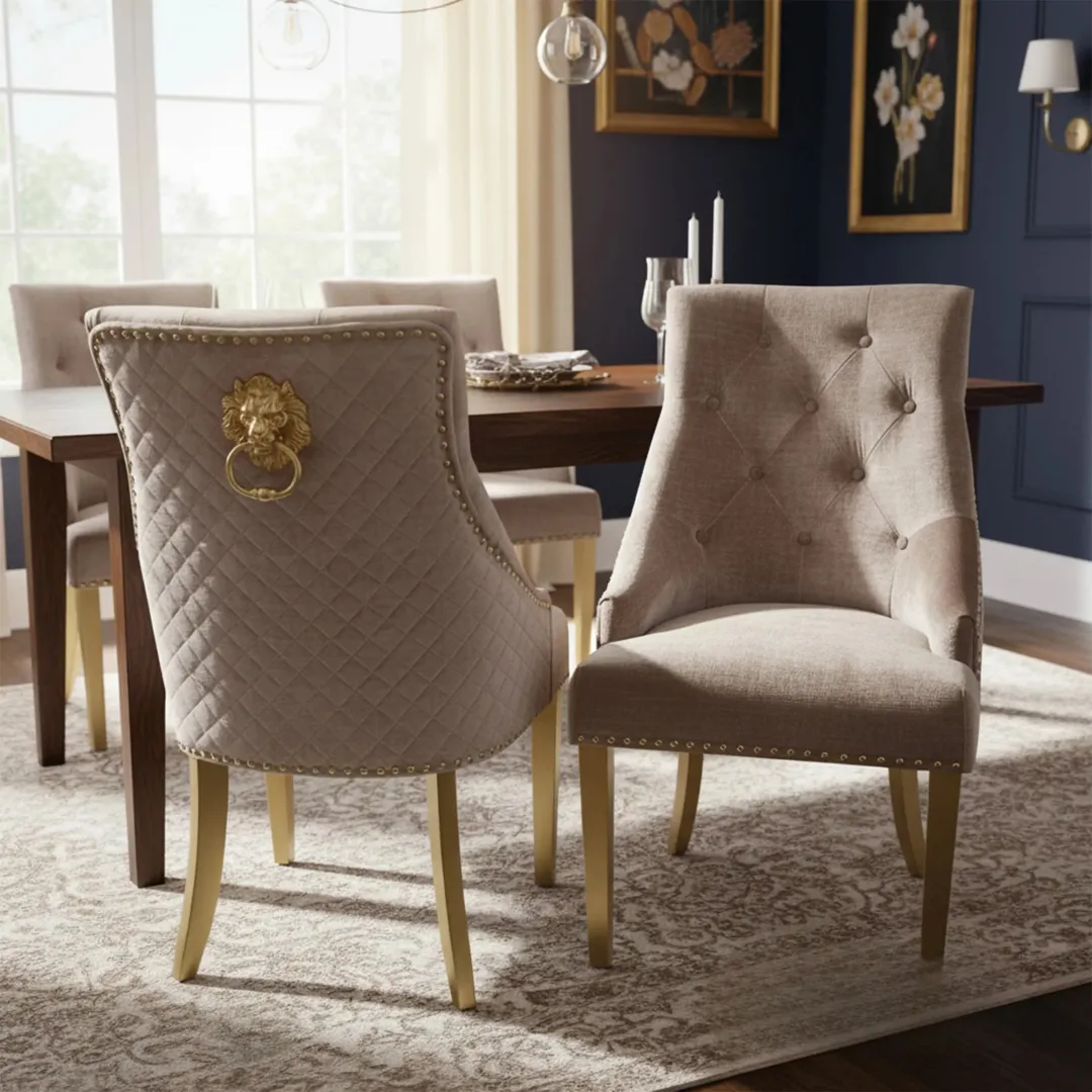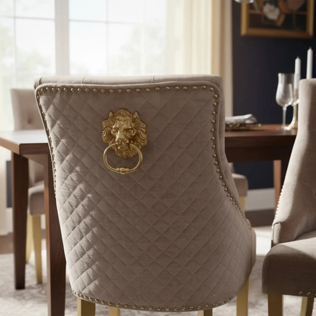 The Henrik Gold Dining Chair brings a perfect blend of elegance, comfort, and sophistication. Upholstered in a soft beige velvet finish, and featuring a polished gold detailed lion knocker with quilted stitching on the backrest, Henrik is designed to elevate your dining space