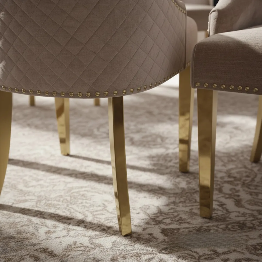 Its refined studding detailing around the edges adds a classic touch, while the high-quality gold straight legs, gently curved at the back, ensure both stability and a premium finish. Perfect for creating a sophisticated dining setup, Henrik offers durability and timeless style.