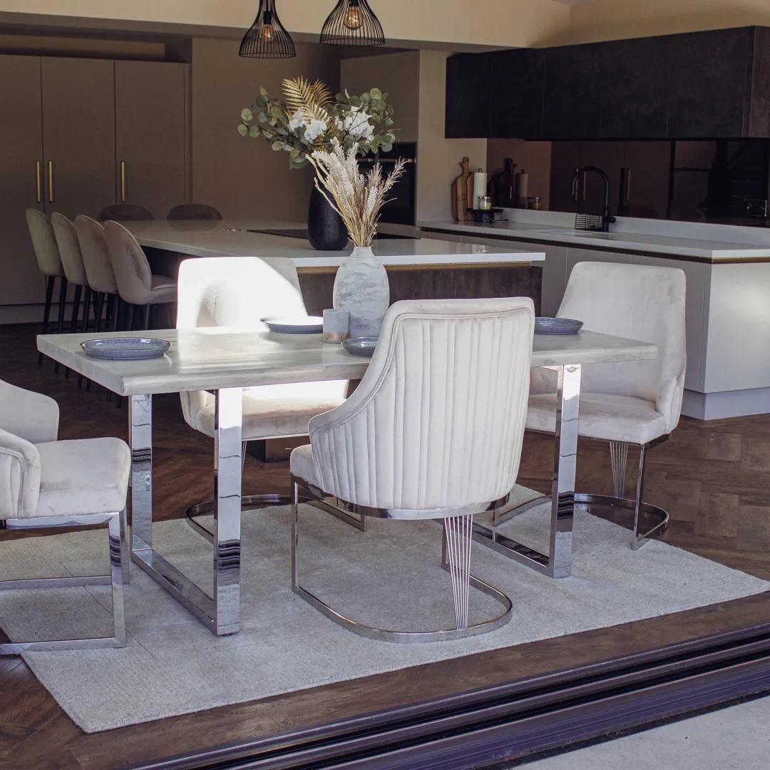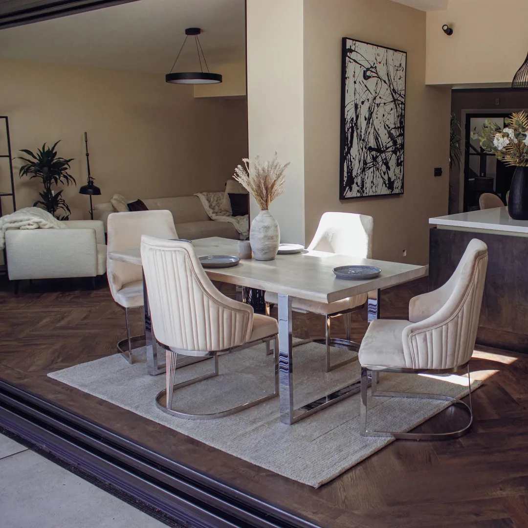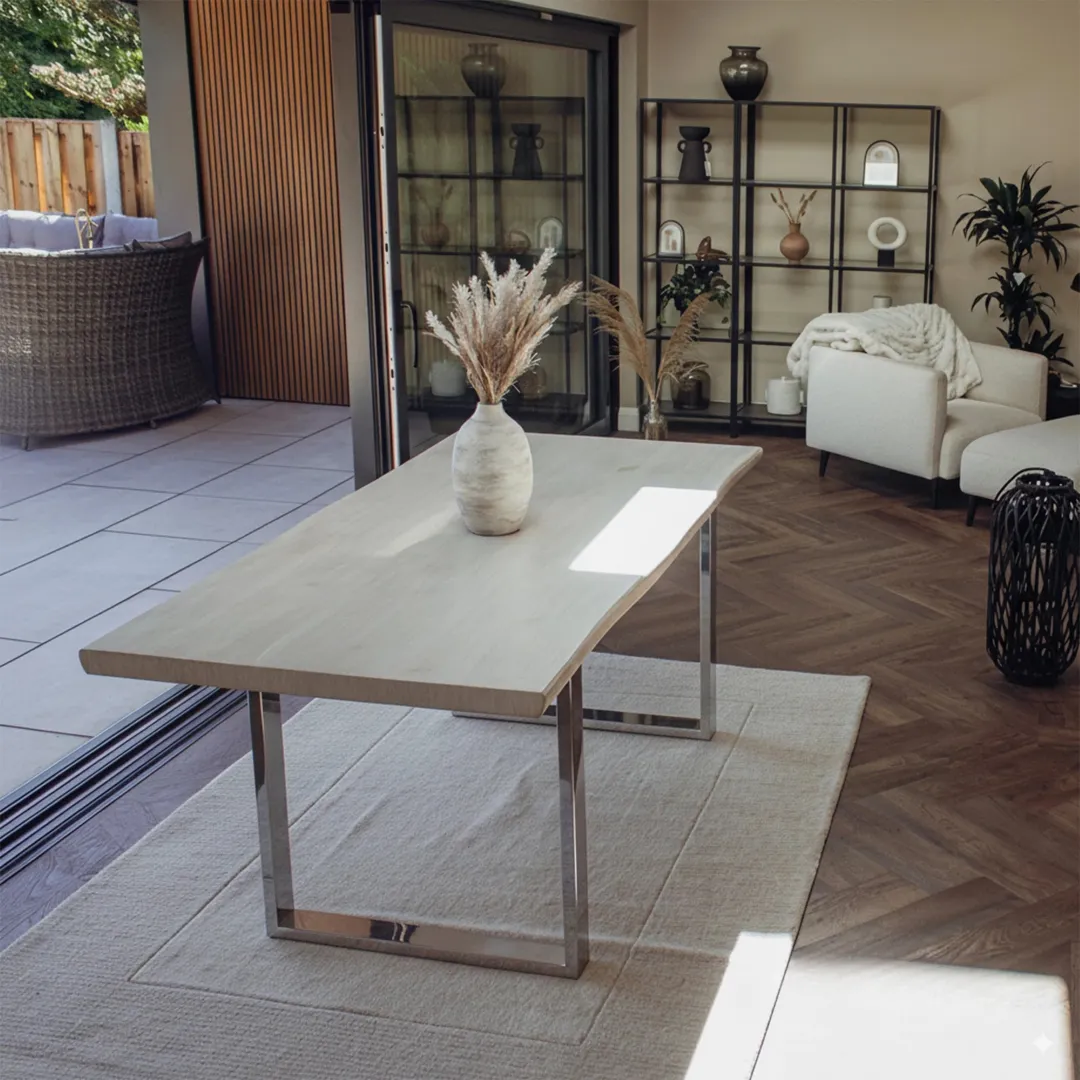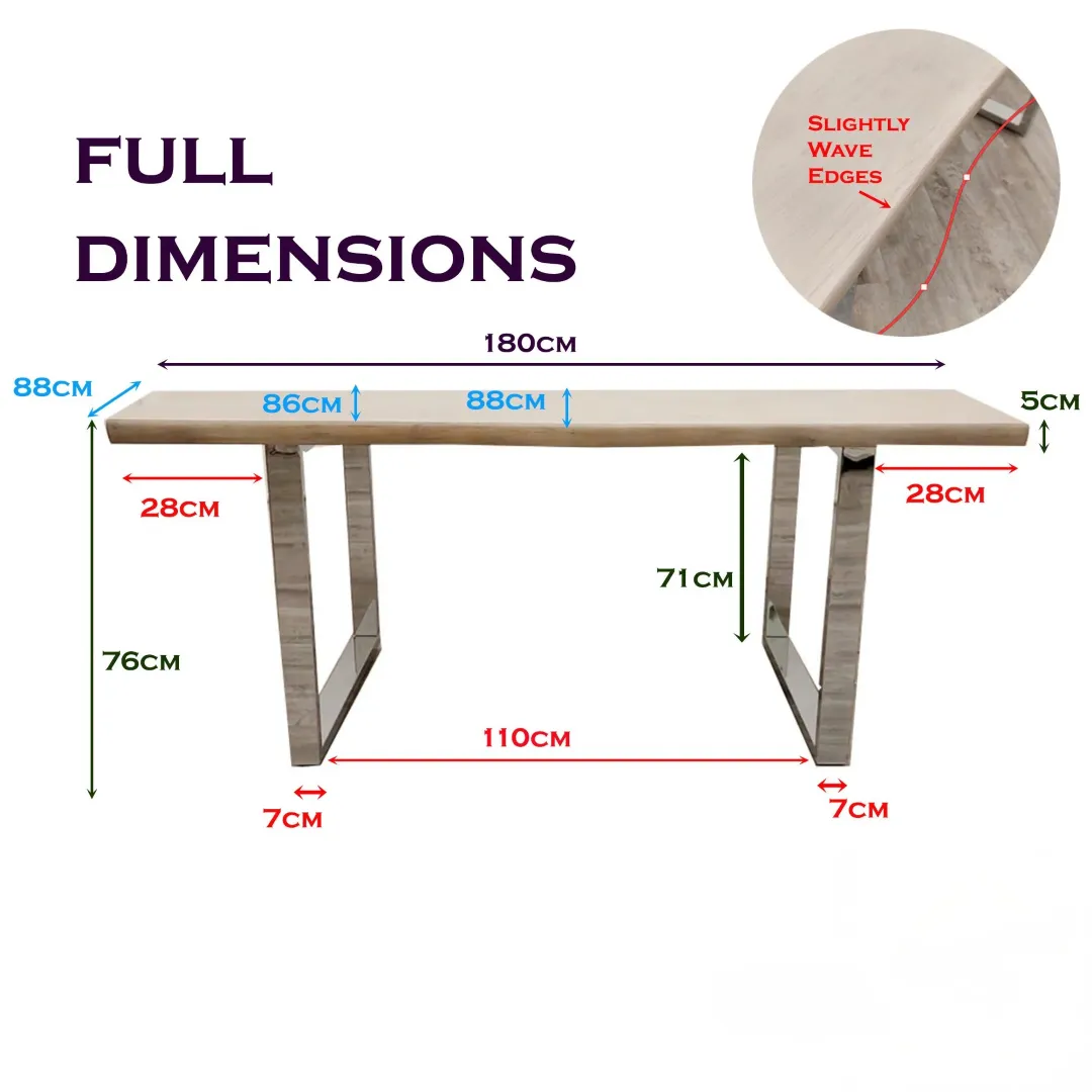 Accommodating 4 to 6 guests, this table is as practical as it is stylish. The 5cm thick tabletop offers exceptional scratch resistance and structural strength, while the chrome-finished square metal legs add a sleek contrast to the rustic grain of the wood.