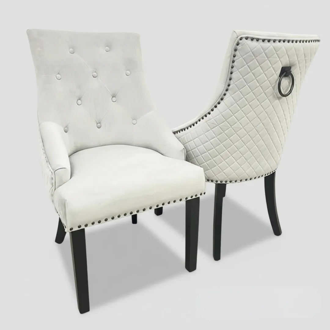 - Gunnar velvet chairs feature a quilted back, studded border, and matte black ring knocker
