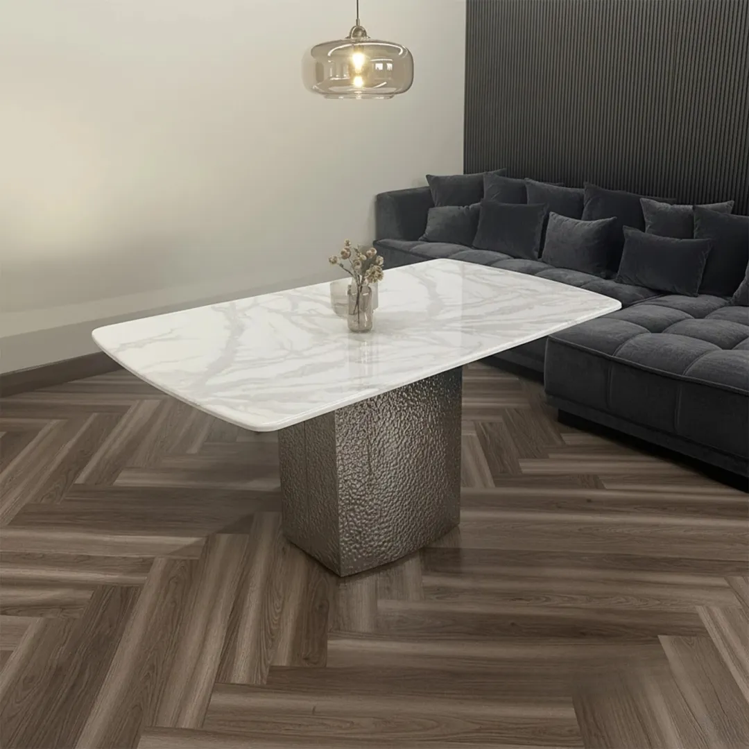 The Lucca 1.8m Rectangular Slimline Dining Set combines a luxurious marble tabletop with Gunnar Velvet Dining Chairs, creating a sophisticated and timeless dining experience. Its slimline form and hammered metal block base bring a modern edge to elegant living.