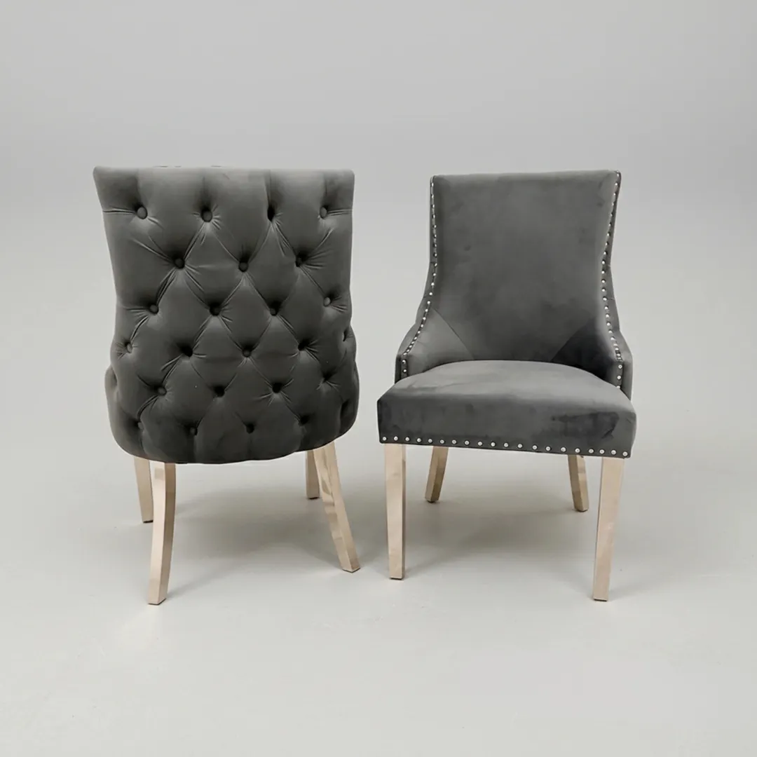 - Oskar velvet chairs feature a button-back design, stud detailing, and chrome curved legs