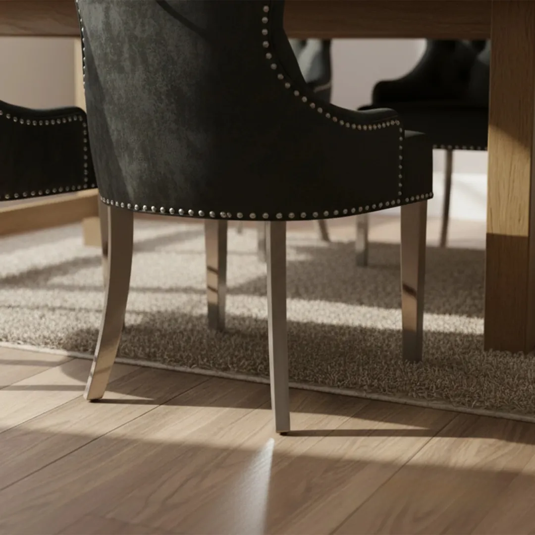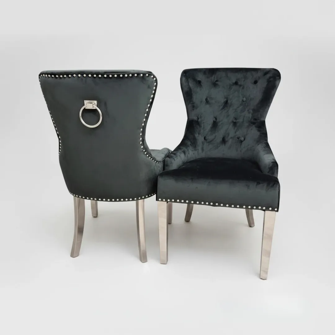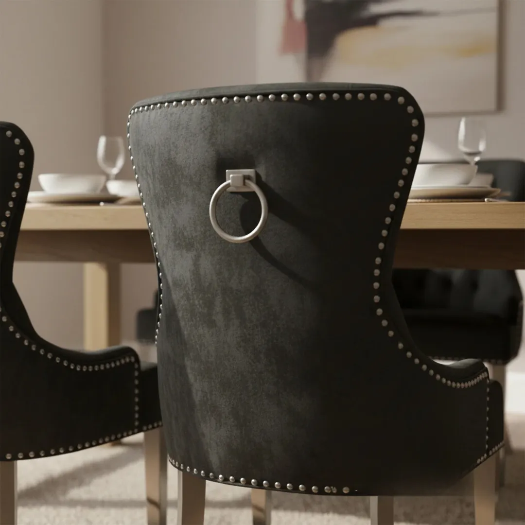 The Megan Ring Knocker Dining Chair combines modern elegance with timeless sophistication. Featuring a luxurious velvet finish, a polished chrome ring knocker, and refined studded detailing, this chair brings a touch of luxury to any dining space.