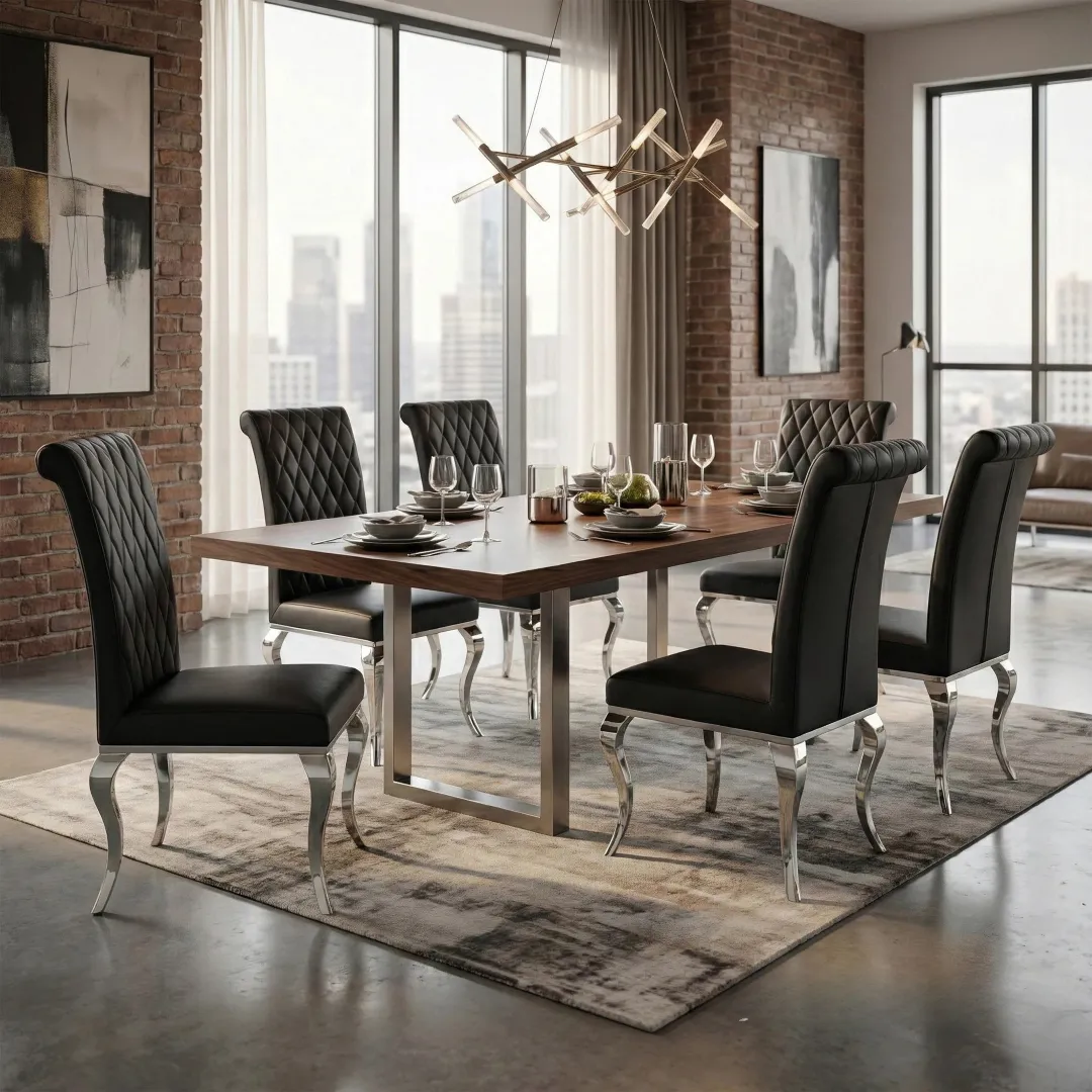 The Niklas Black Faux Leather Dining Chair effortlessly combines contemporary elegance with exceptional comfort. Upholstered in premium midnight-black faux leather, the chair features a distinctive cross-stitch backrest that adds a layer of textural intrigue to its sleek silhouette. This piece is the perfect embodiment of durable luxury for the modern home.