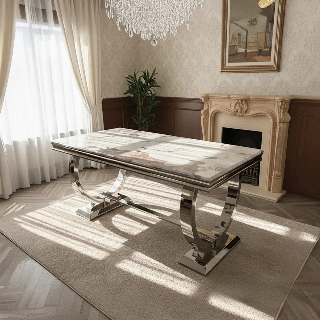 Ultra chic and stylish, the Orvar dining table redefines high-end living with scratch-resistant marble, sleek chrome, and an easy-clean finish – the perfect blend of practicality and luxury.