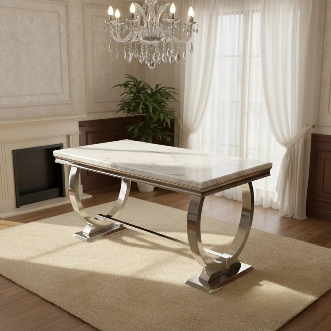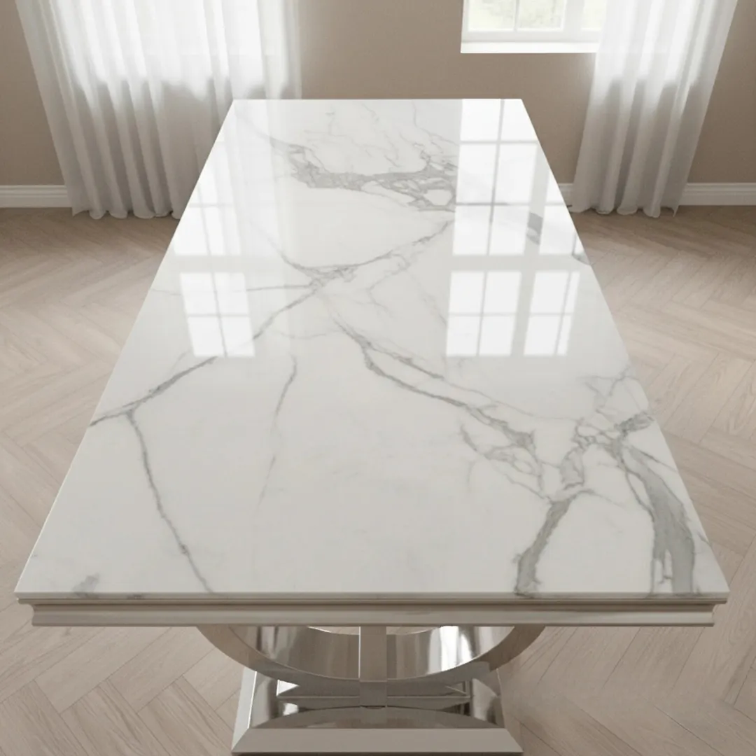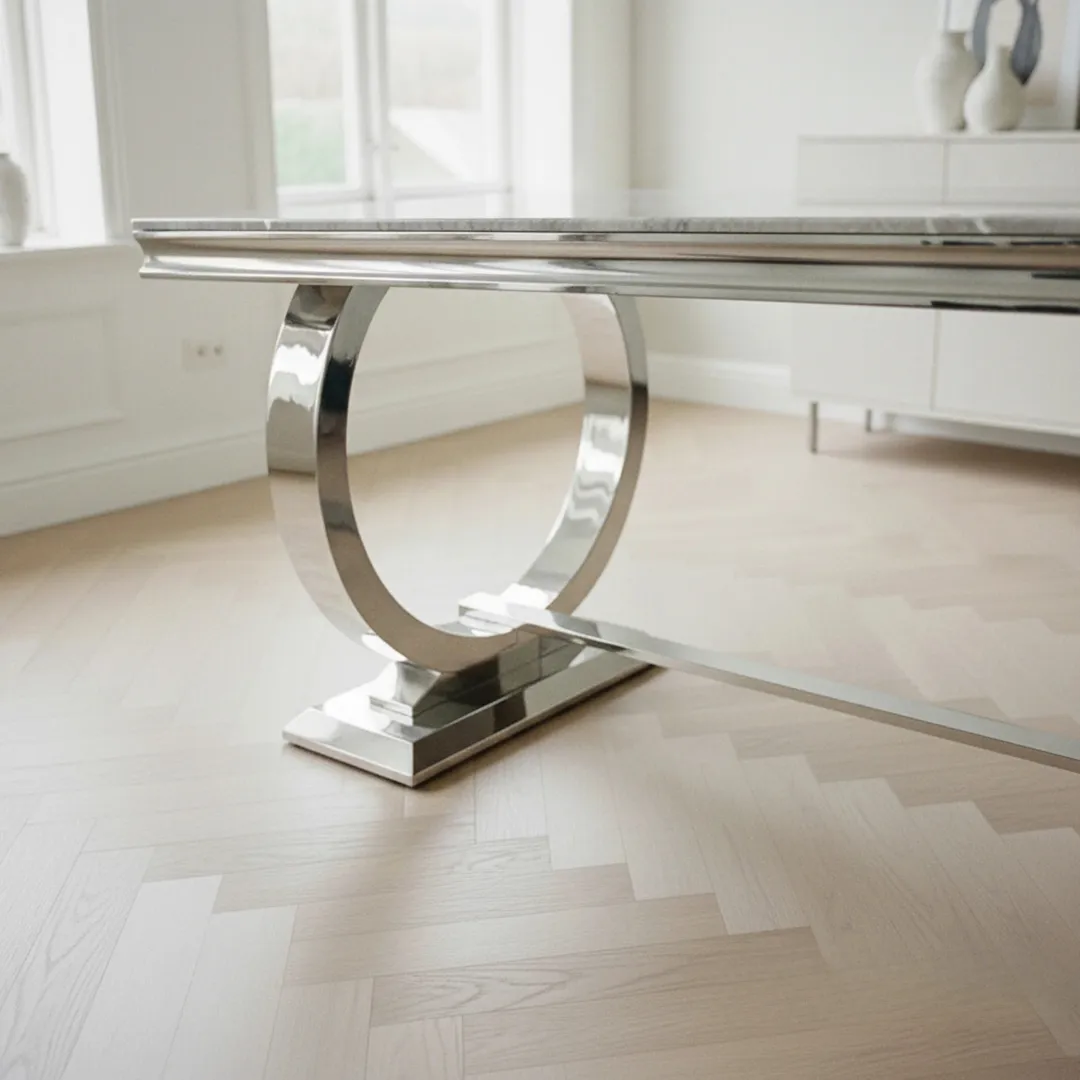 The Orvar 150cm Rectangular Marble Dining Table is designed with a bold double ring chrome pedestal base, bringing a statement look to your dining space while comfortably seating 4–6 people.