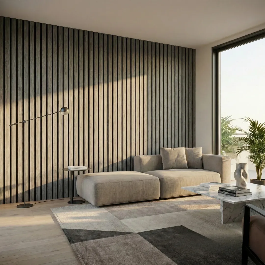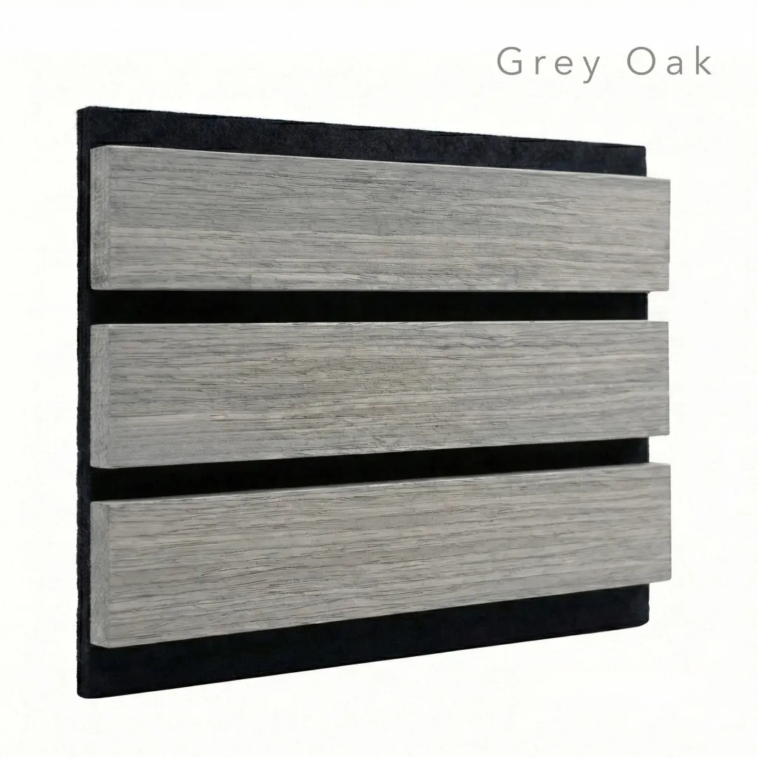 Enhanced with Premium Quality three-sided real wood veneer, each slat provides a seamless, sophisticated grey oak finish from every angle. Mounted on a dense 9mm PET acoustic felt backing, these panels effectively reduce ambient noise by up to 22%, making them ideal for creating calmer, more comfortable environments in minimalist homes or modern offices.