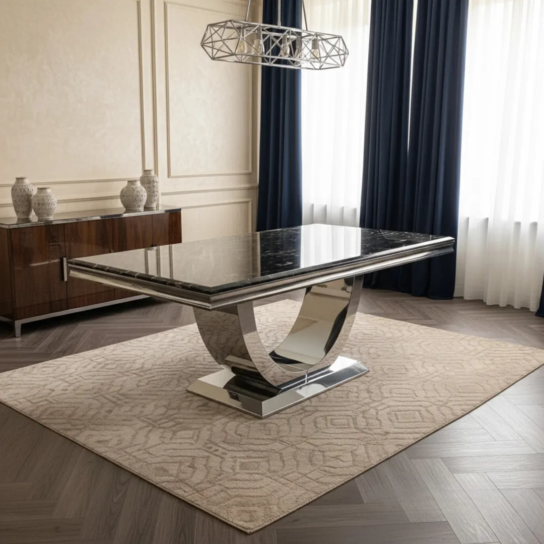 Designed to seat up to 10 people, the Urban table offers exceptional practicality while maintaining a high-end aesthetic. The solid U-shaped pedestal base ensures excellent stability, and its smooth, wipe-clean marble surface is perfect for everyday use in busy households.