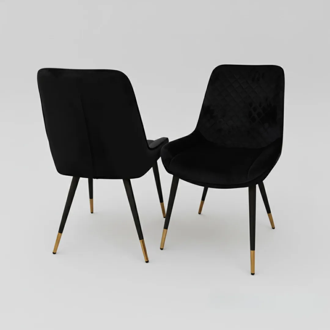 Lyder Dining Chairs feature soft velvet upholstery, cross-stitch detailing, and Scandinavian-inspired black metal legs. Fully UK Fire Retardant Tested for comfort and longevity.